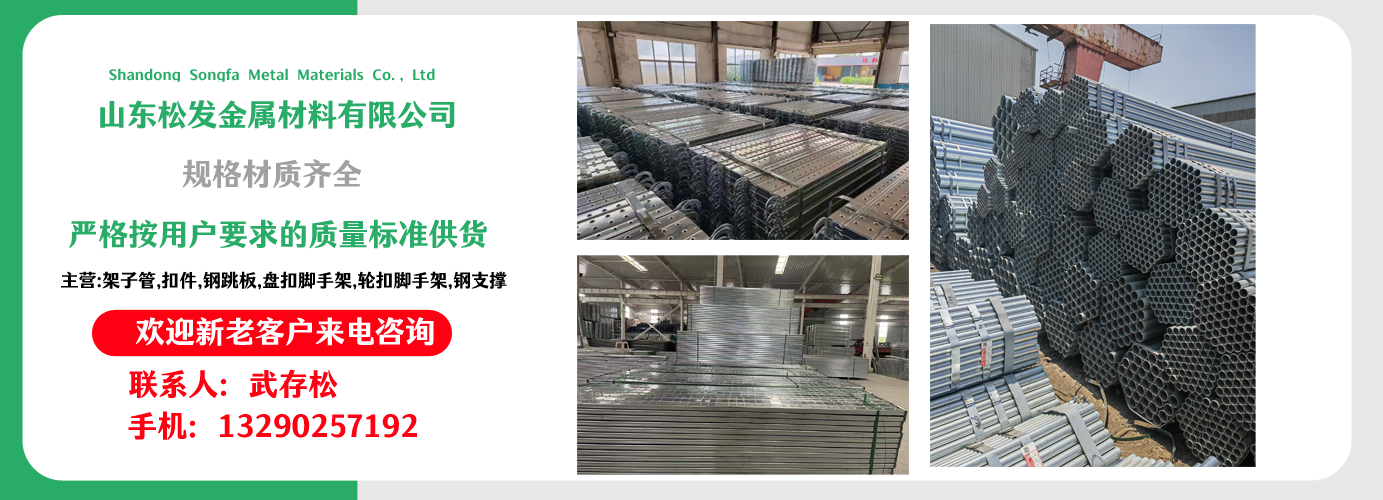 山東松發(fā)金屬材料有限公司主營架子管,扣件,鋼跳板,盤扣腳手架,輪扣腳手架,鋼支撐生產(chǎn)廠家。本廠專業(yè)生產(chǎn)銷售?! 〗ㄖ眉茏庸?、 主要用于房建,橋梁,鐵路,公路,地鐵,水庫,隧道,支撐?! 〖茏庸?扣件,鋼跳板,盤扣腳手架,輪扣腳手架,鋼支撐的優(yōu)越性及應(yīng)用“ ”產(chǎn)品因具有結(jié)構(gòu)簡單合理、設(shè)計(jì)巧妙、使用方便、安全、快捷、易于運(yùn)輸、儲(chǔ)存、維護(hù)簡單等特點(diǎn)?! 」疽回瀳?jiān)持“質(zhì)量,用戶至上,優(yōu)質(zhì)服務(wù),信守合同”的宗旨,憑借著高質(zhì)量的產(chǎn)品,良好的信譽(yù),優(yōu)質(zhì)的服務(wù),產(chǎn)品暢銷全球。歡迎廣大客戶來電洽談,共同發(fā)展,共創(chuàng)輝煌! 山東松發(fā)金屬材料有限公司秉承誠信服務(wù)、恪守信譽(yù)的宗旨,在同等的質(zhì)量下,保證以最低的價(jià)格,最完善的服務(wù),最高的信譽(yù)來答謝各界朋友的支持和厚愛,歡迎您的來電、咨詢,我們將竭誠為您服務(wù)!...